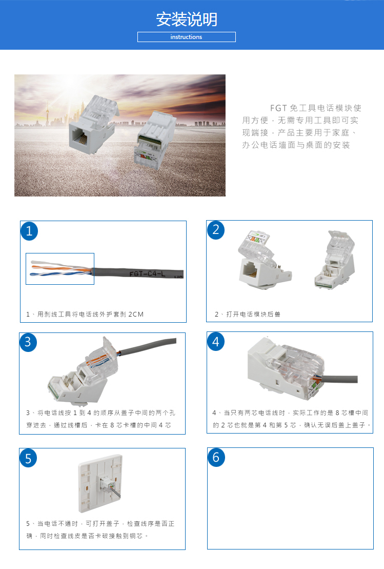 4芯電話模塊采用免壓接式安裝,用于各種電話線端接,無需工具,即可實(shí)現(xiàn)端接。方便快捷。執(zhí)行標(biāo)準(zhǔn):YD/T 926.3。